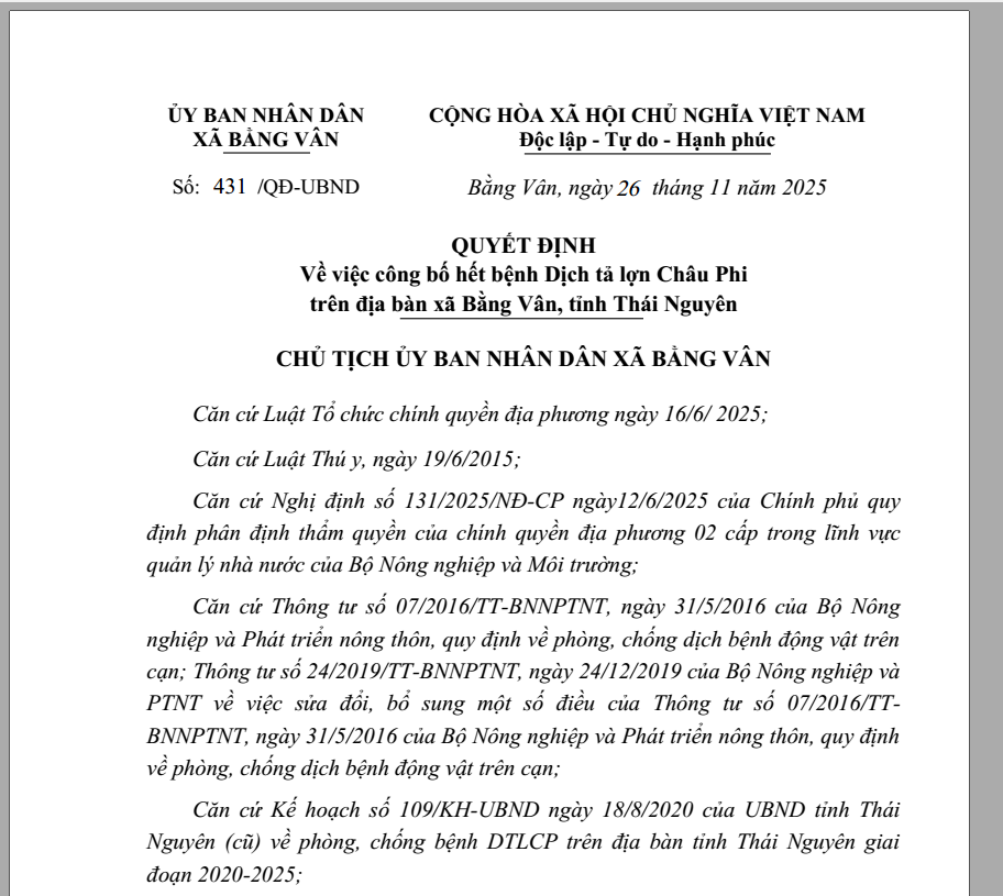 Chủ tịch UBND xã quyết định công bố hết bệnh Dịch tả lợn Châu Phi trên địa bàn các thôn xã Bằng Vân, tỉnh Thái Nguyên, kể từ ngày 28 tháng 11 năm 2025.